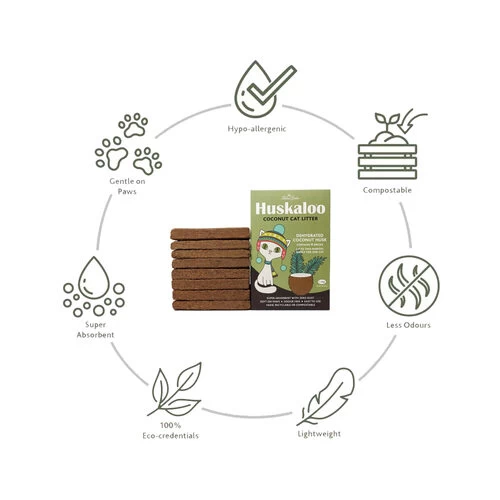 Huskaloo ist ein ökologisches und kompaktes Katzenstreu, das aus Kokosnussschalen hergestellt wird. Die Kokosnussschalen werden dehydriert und zu praktischen Ziegeln gepresst. Diese Steine sind kompakt, viel leichter als Katzenstreu aus Ton und völlig natürlich. Wenn Sie warmes Wasser darüber gießen, dehnt sich der Block aus und Sie können ihn über dem Katzenklo verteilen. Es ist angenehm weich für die Pfoten Ihrer Katze und außerdem geruchs-, chemikalien- und staubfrei. Diese Kokosnussschalenbasis ist bis zu zehnmal saugfähiger als andere Katzenstreueinlagen und kann nach Gebrauch einfach auf den Kompost gegeben werden.