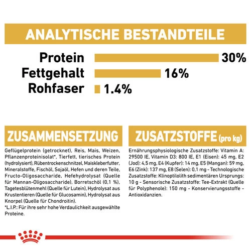 Geflügel dehydrierte Proteine, Reis, Mais, Isolat aus pflanzlichen Proteinen, Weizen, tierische Fette, Hydrolysat aus tierischen Proteinen, Maiskleber, Rübenschnitzel, Mineralien, Fischöl, Sojaöl, Hefe, Fructo-Oligo-Saccharide, Hefe-Hydrolysat (Quelle für Manno-Oligo-Saccharide), Borage-Öl (0.1%), (afrikanischer) Tagetes-Extrakt (Quelle des Luteins), Extrakte aus grünem Tee und Trauben (Quelle der Polyphenole), Hydrolysat aus Krustentieren (Quelle des Glucosamins), Hydrolysat aus Knorpel (Quelle des Chondroitins).
