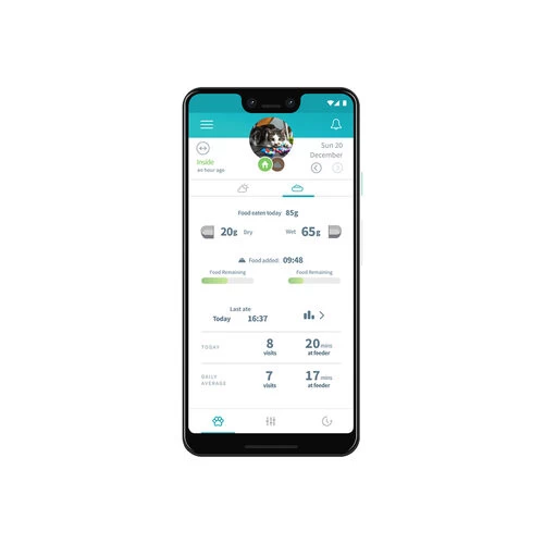 Im Bogen des Napfes befindet sich ein Sensor, der einen Mikrochip oder einen RFID-Halsbandanhänger sofort erkennt. Nach der Erkennung öffnet sich die Klappe automatisch. Wenn Ihr Haustier keinen Mikrochip hat, können Sie einen RFID-Halsbandanhänger an seinem Halsband befestigen. Sie können die entsprechende App (Sure Petcare App) auf Ihr Telefon herunterladen. Wenn Sie sich dann mit dem Futterautomaten verbinden, können Sie beobachten, wie viel und wie oft Ihre Katze frisst. So lässt sich eine Veränderung des Essverhaltens leicht erkennen.